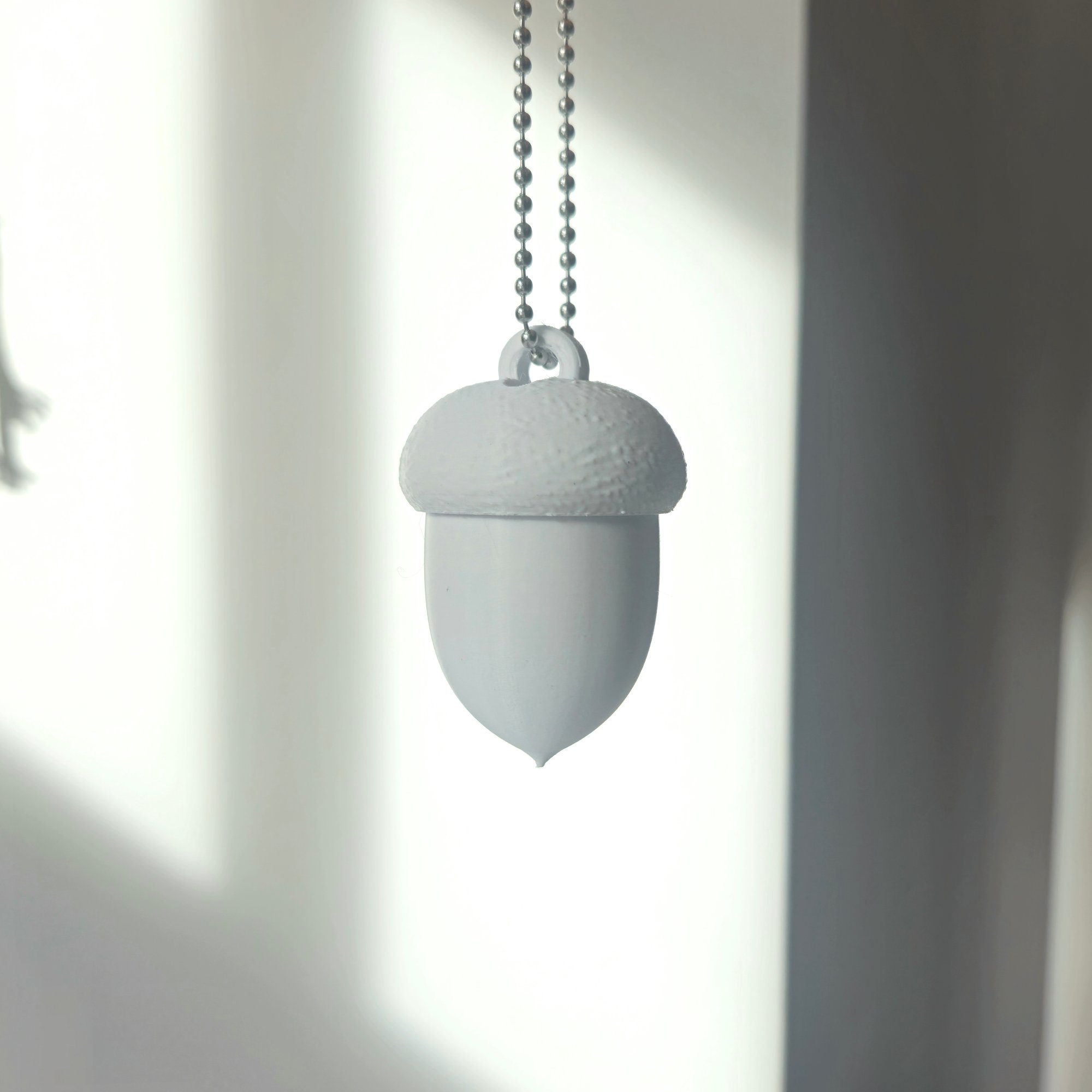 A hanging acorn model with metal ball chain.